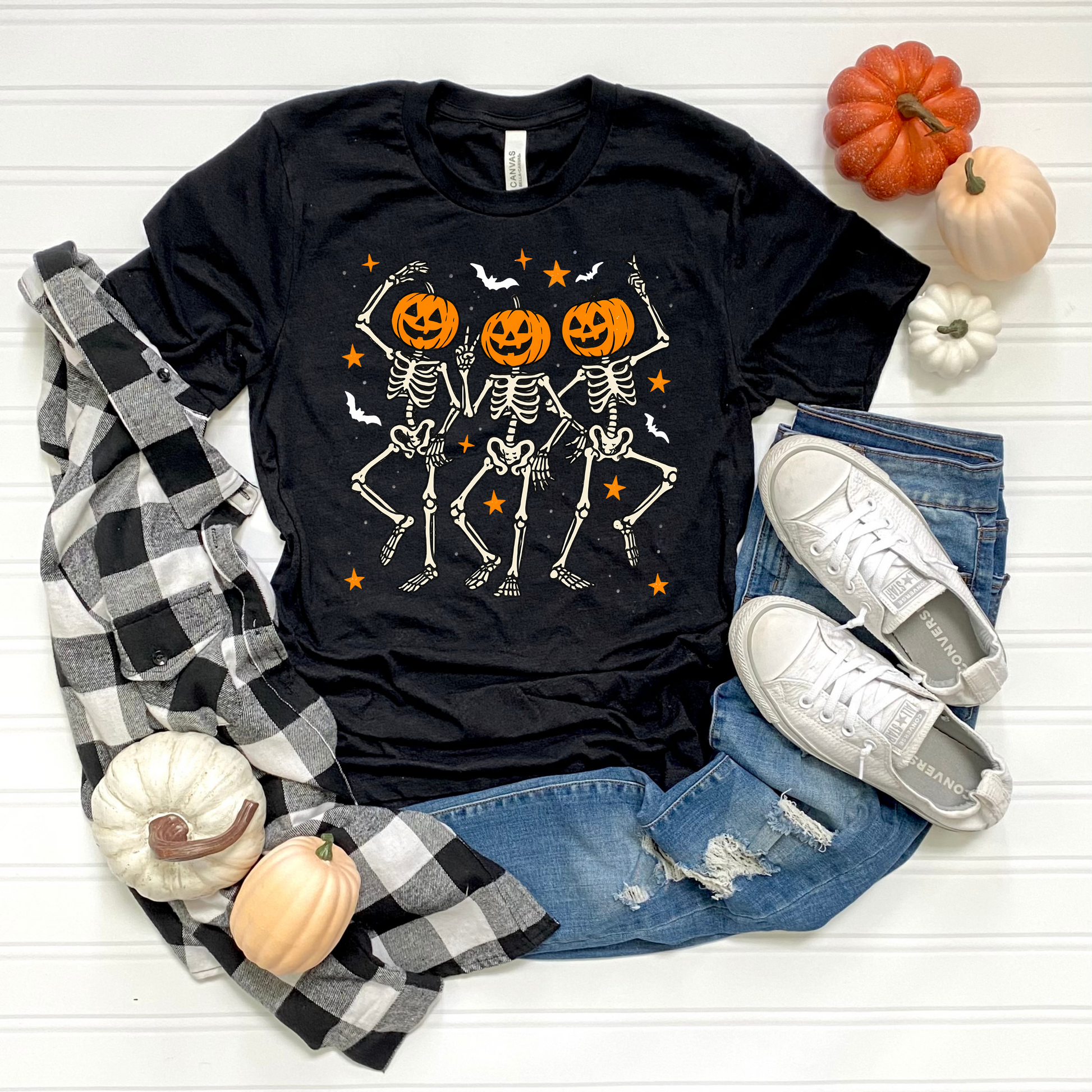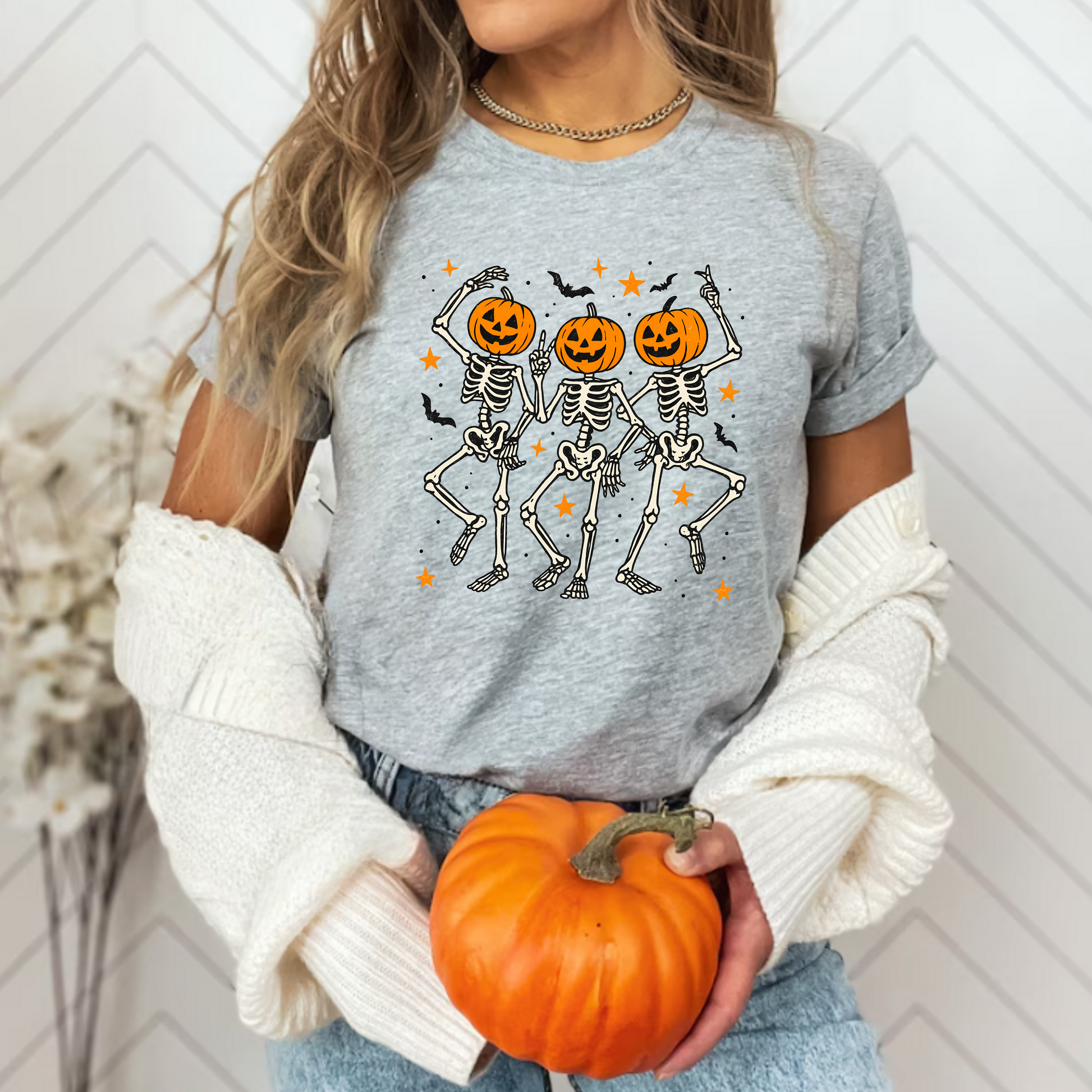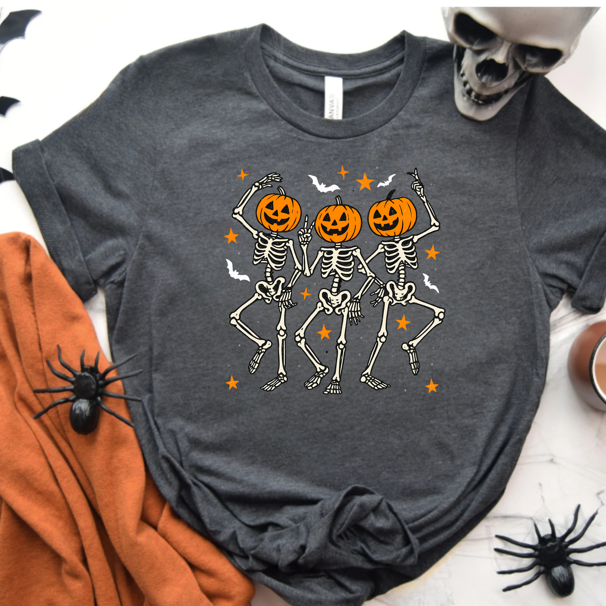 - Features dancing skeletons with pumpkin heads design