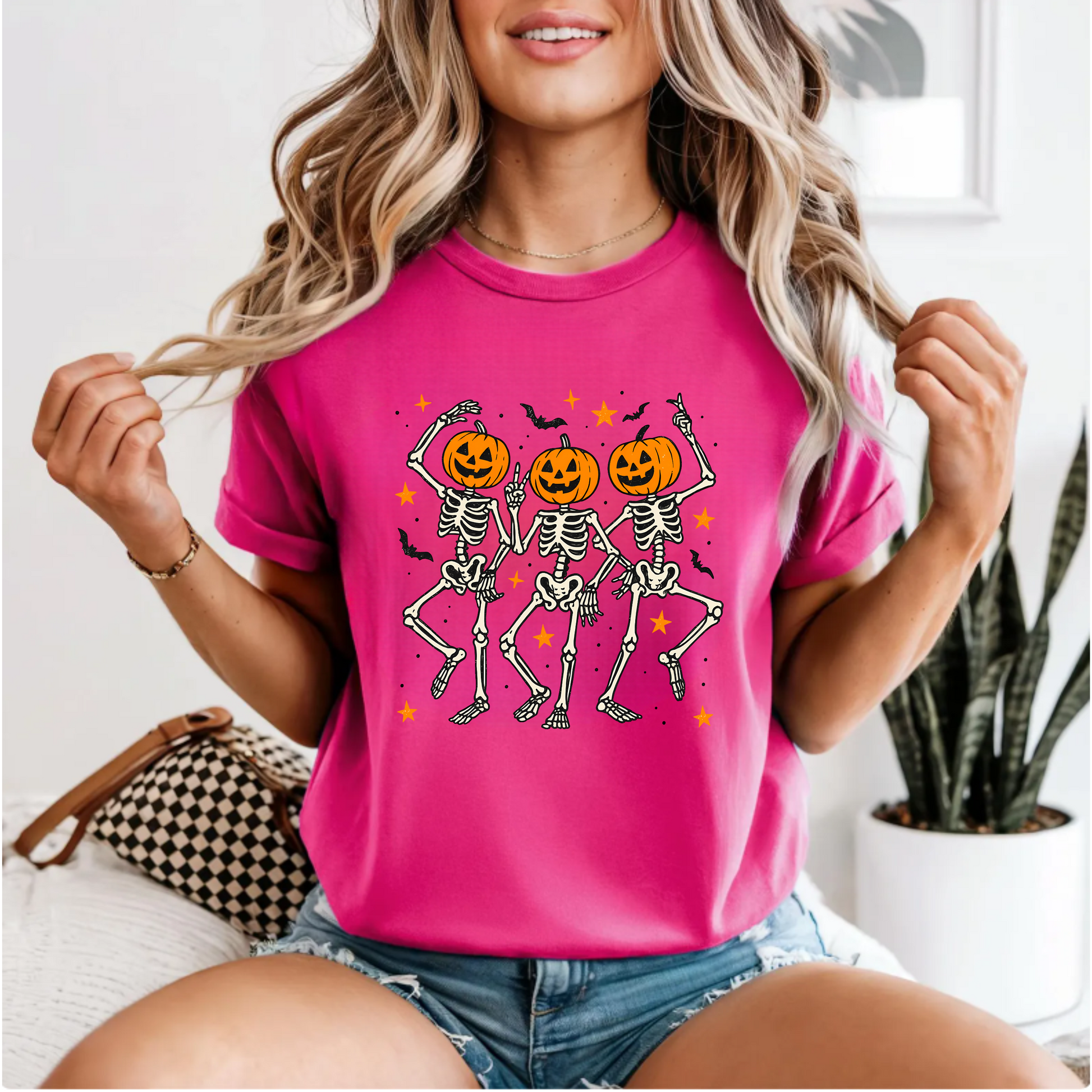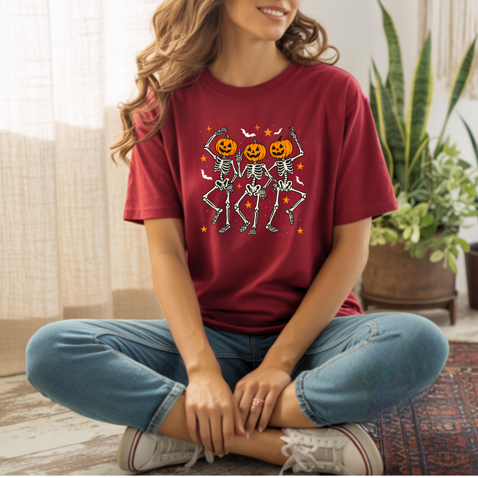 This T-Shirt featuring dancing skeletons with pumpkin heads offers a spooky and playful vibe, perfect for Halloween enthusiasts. Made from soft and durable fabric, this unisex tee is ideal for adults looking to add a touch of Halloween spirit to their wardrobe.